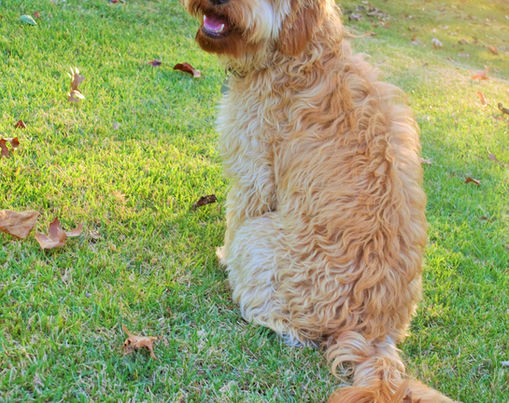Ginger is our gentle soul! She is a very calm loving girl who just wants to be a lap dog and is very eager to please her family. Ginger is a F1 mini goldendoodle and weighs 30 lbs. She has a gorgeous red color and has a soft curly coat type. Ginger's parents were a 55 lbs. AKC Golden Retriever and a 8 lbs. AKC red Toy Poodle. Ginger has also been cleared for 165 genetic diseases through Embark!